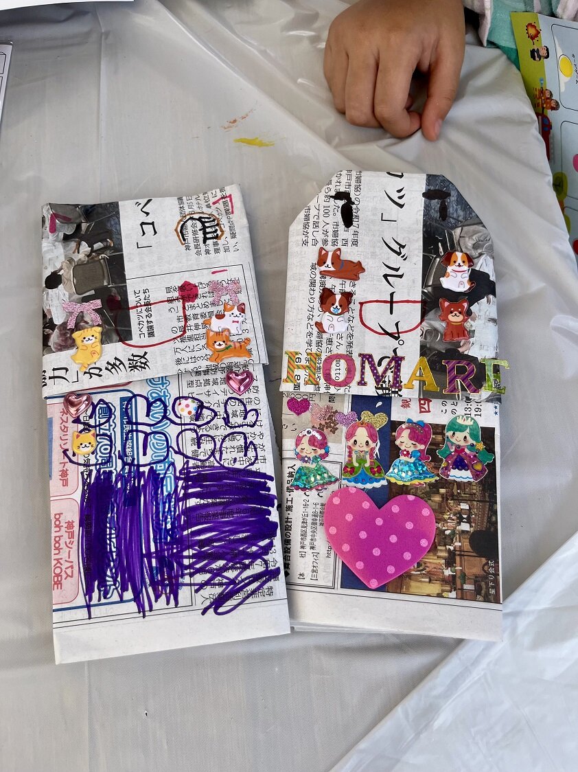 本学からは地域連携研究センター所属の学生団体Shoin Rootsの学生が参加し、ワークショップ「身近なもので作る!防災グッズ体験コーナー」を担当しました。ワークショップでは、災害時に役立てられるよう自宅にある新聞紙やごみ袋、牛乳パックで「紙食器」「紙スリッパ」「ポンチョ」「ホイッスル」を工作しました。最後にマジックで絵を描いたりやシール貼りをして、参加者のみなさんそれぞれに思い思いの作品に仕上げていました。