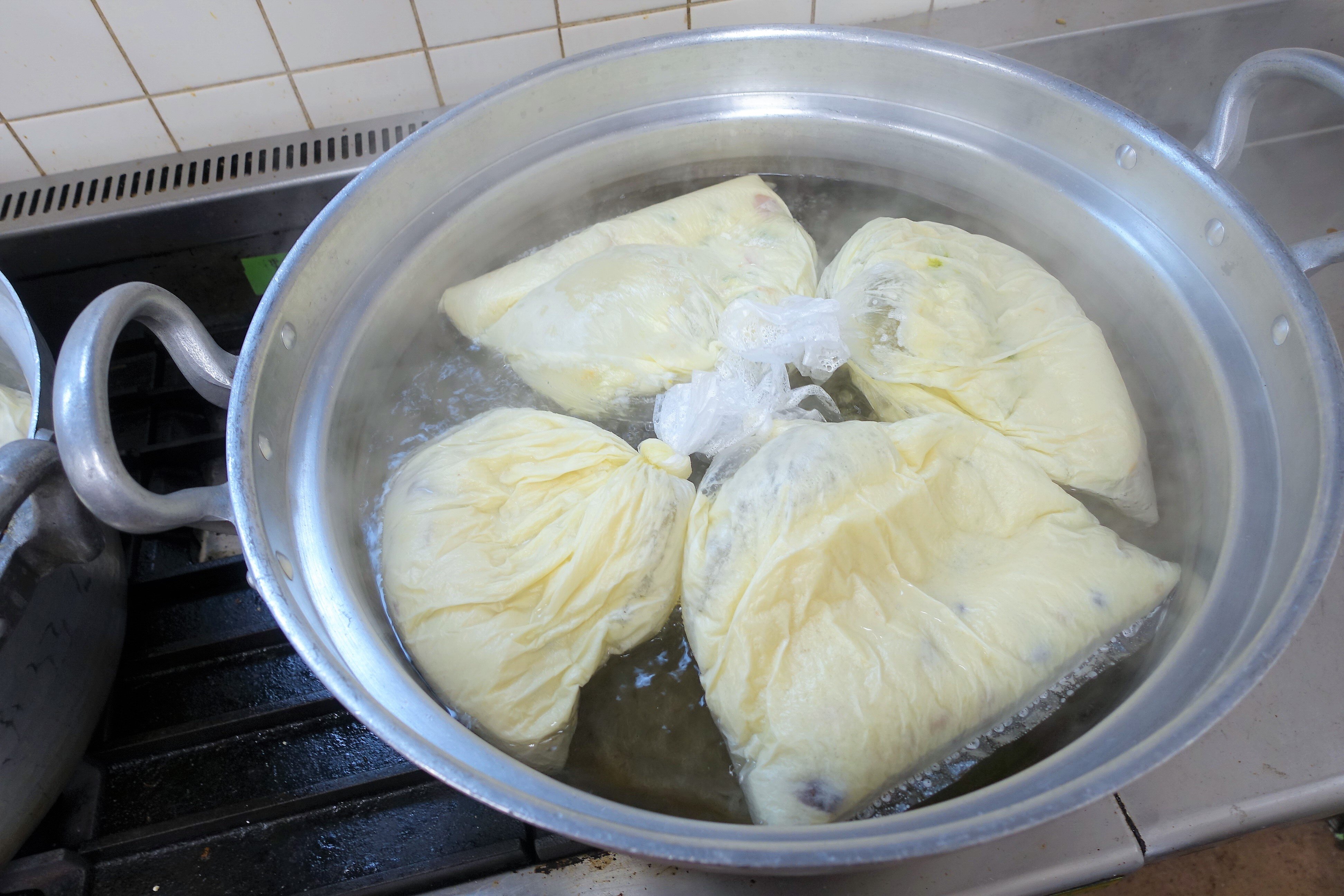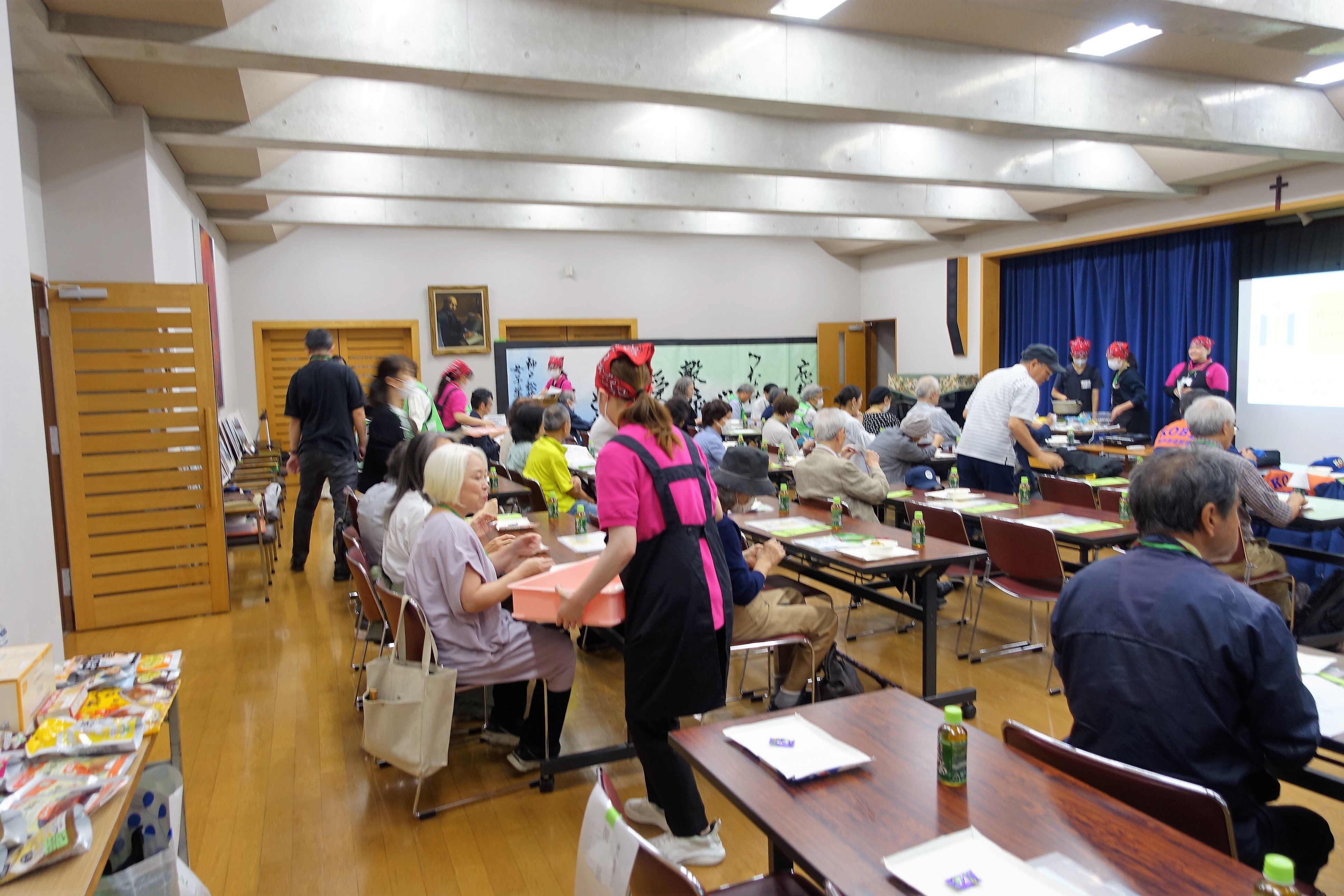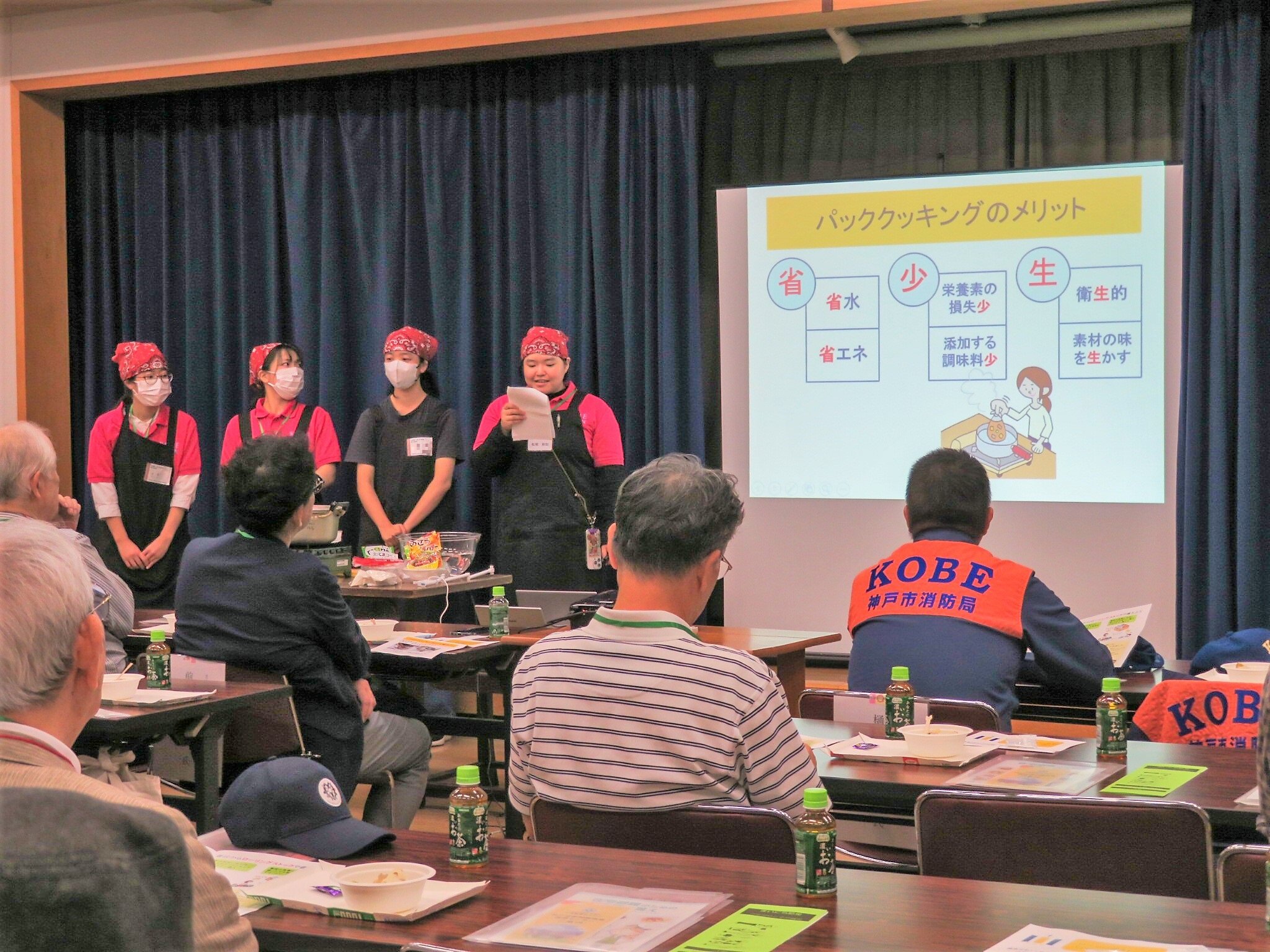 今回は『ローリングストックで「パッククッキング」』と題して「蒸しパン」を2種調理。長期保存が可能な「ローリングストック食材」を材料に、フィッシュソーセージ、粒コーン、豆菓子を使った「食事風」と、蒸し豆や味付きサツマイモを使った「おやつ風」タイプを食べ比べました。試食だけでなく、調理過程が解りやすいよう、ライブ映像をスクリーンに投影しての解説も行いました。