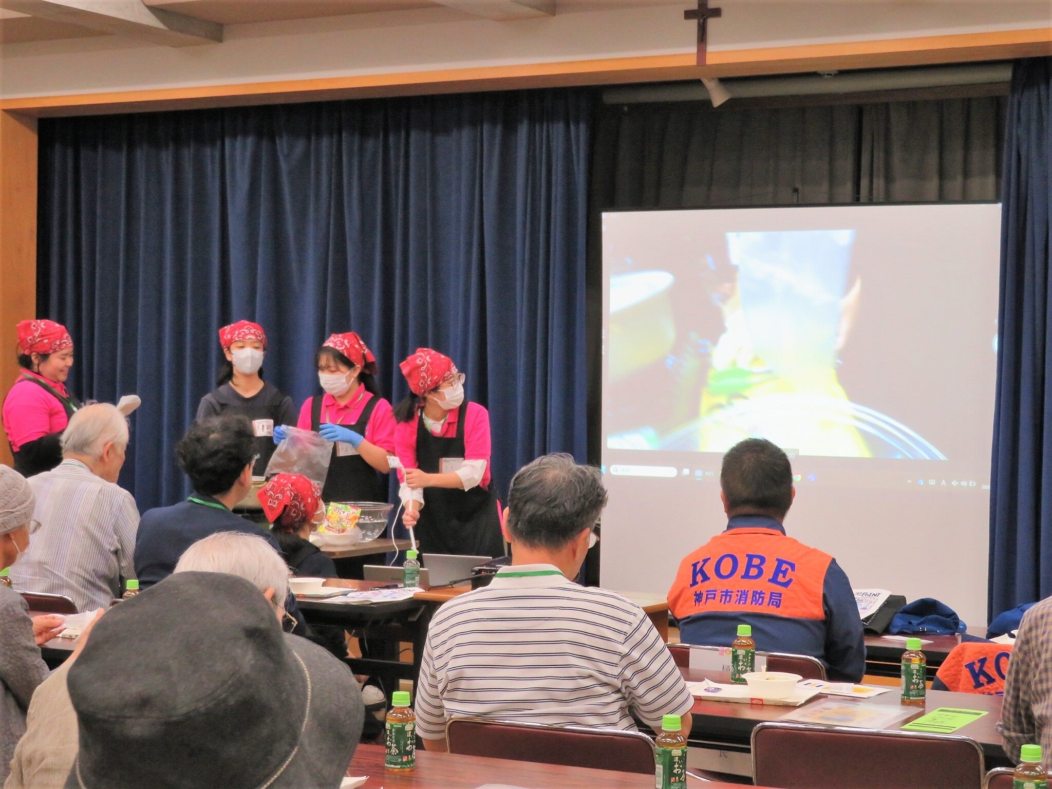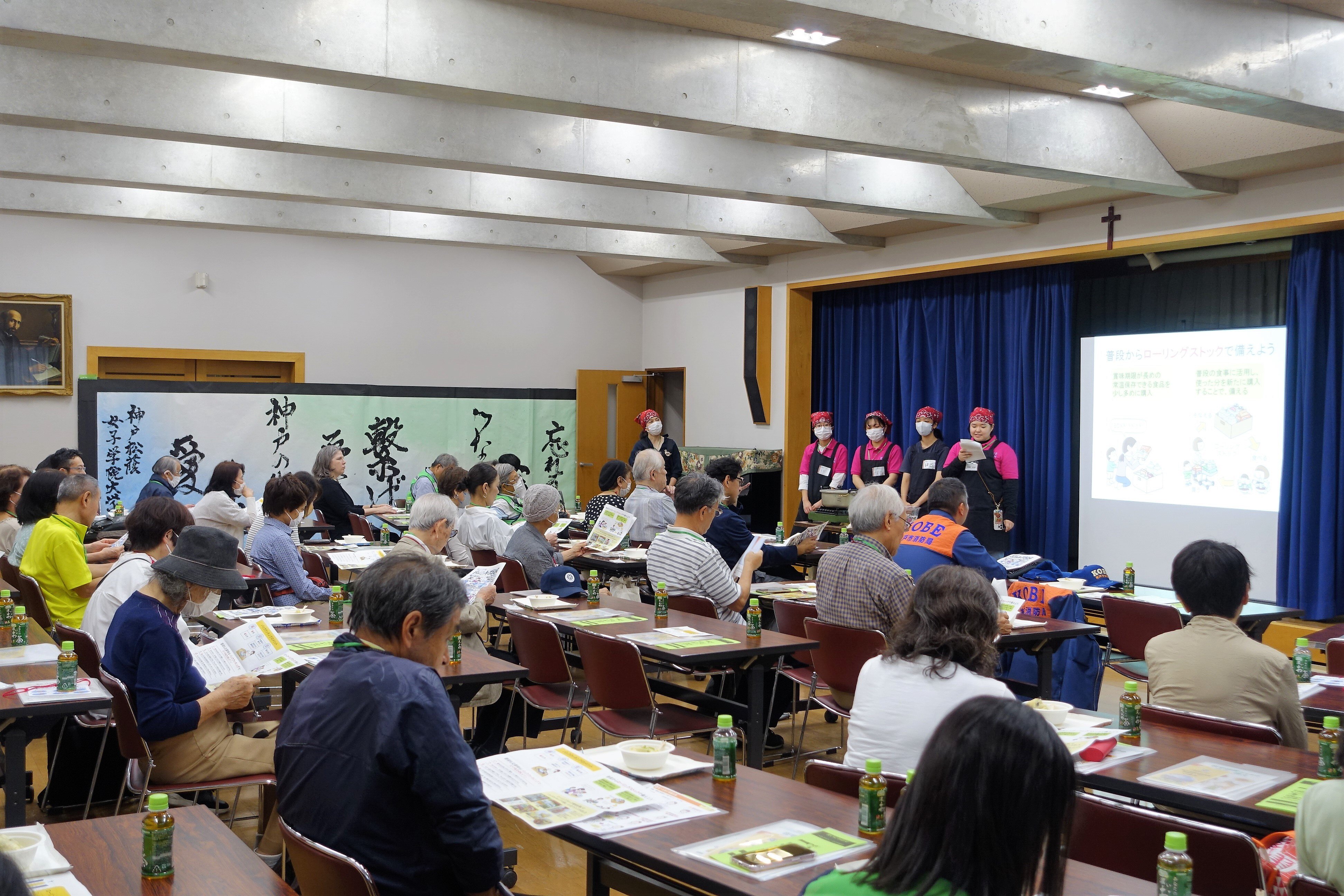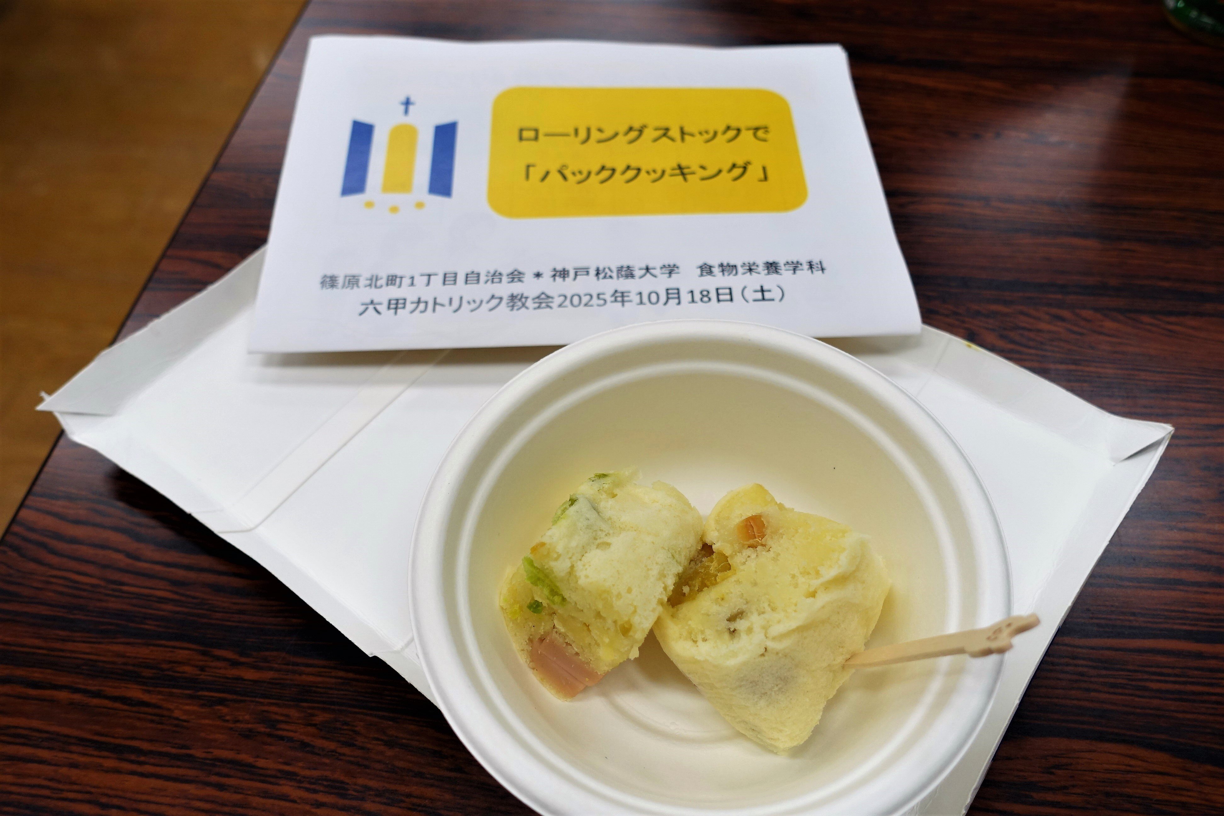 神戸松蔭大学の南側、篠原北町一丁目自治会主催の防災イベントが10月18日、カトリック六甲教会を会場に開催され、人間科学部食物栄養学科の2・3年生および卒業生を含む計7名が参加し、災害時に役立つ「パッククッキング」で作ったメニューの提供や、ライブ形式による調理方法の紹介を行いました。