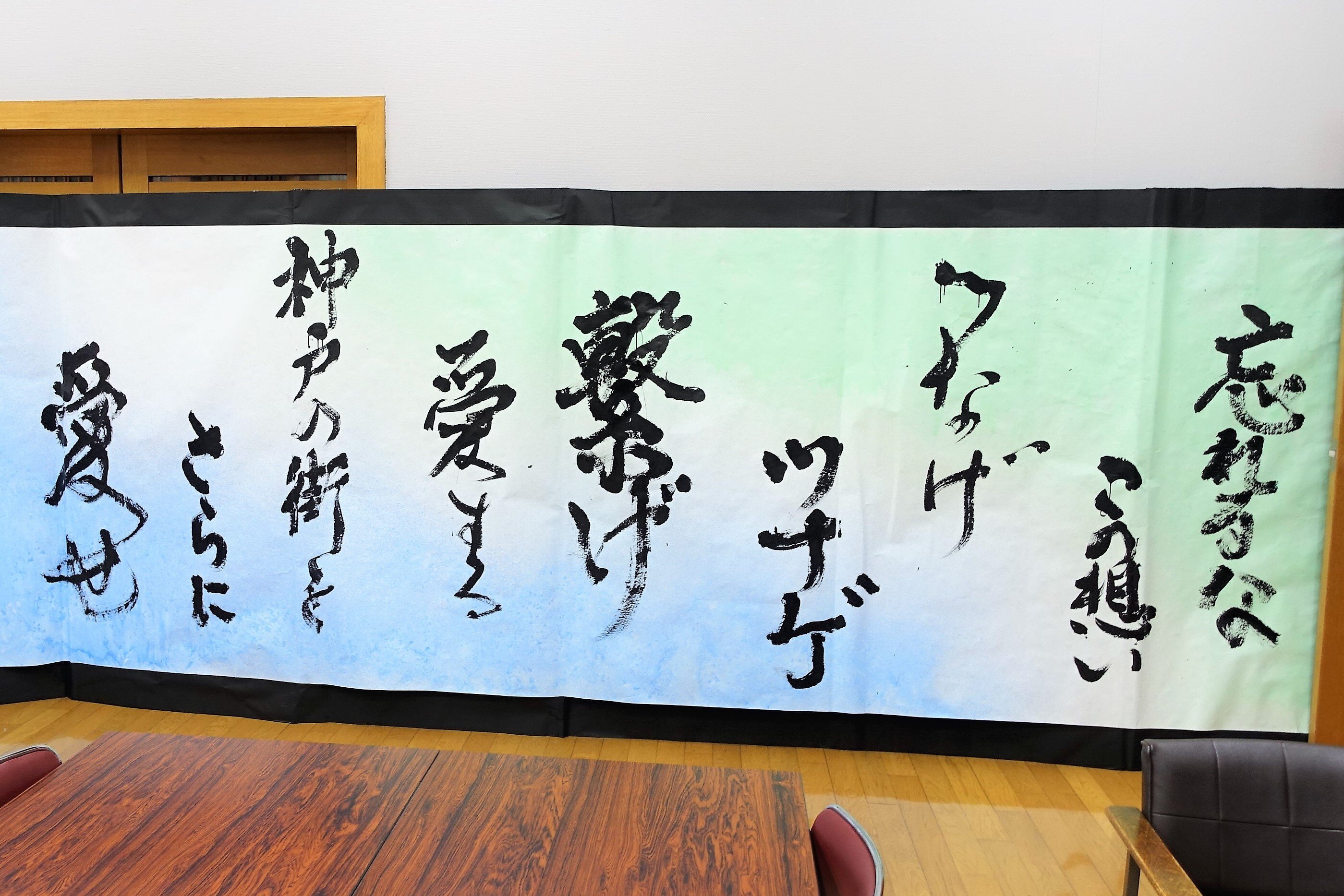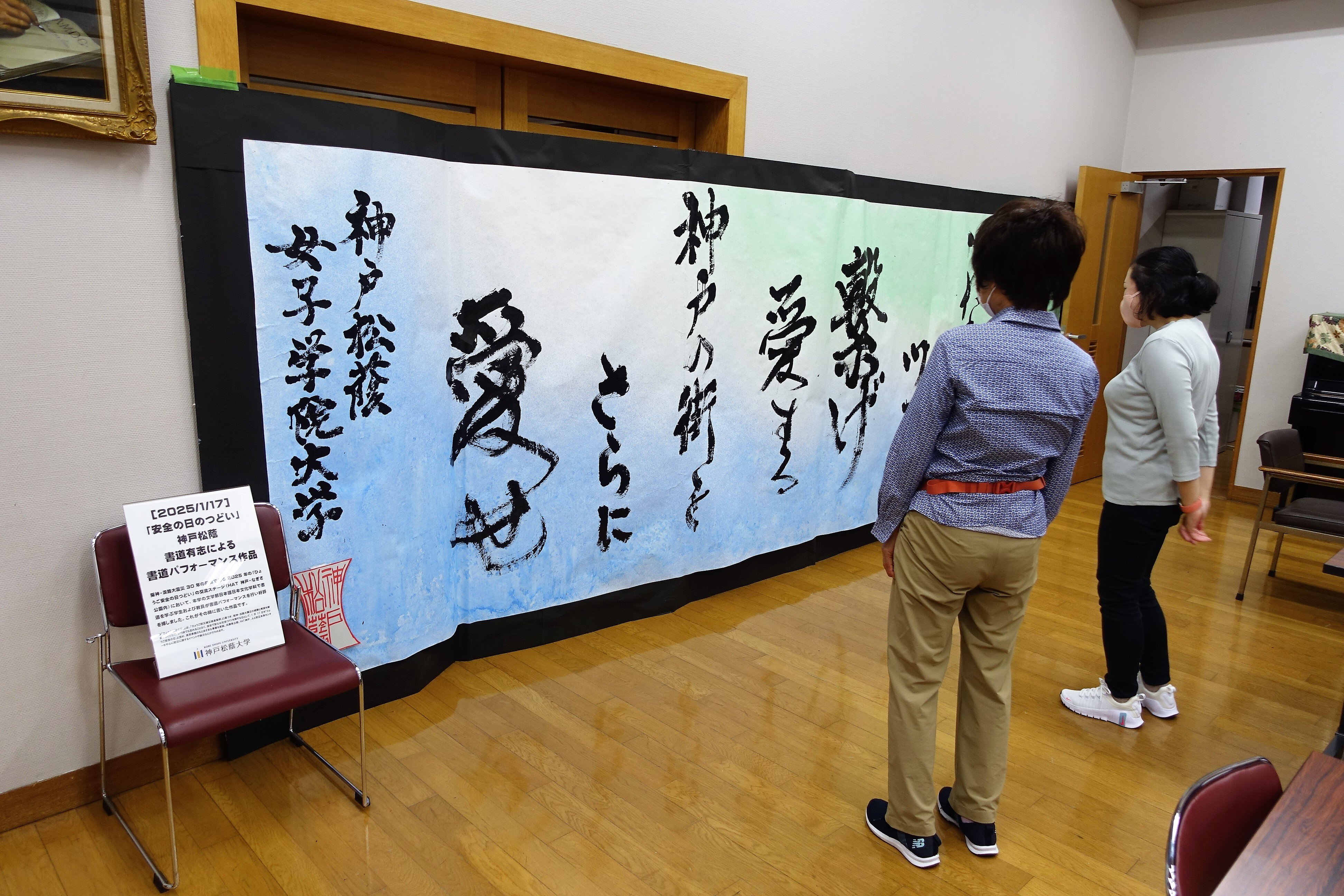 また会場には、文学部日本語日本文学科の書道コース生など書道を学ぶ学生等有志による大きな書作品も展示されました。これは阪神・淡路大震災30年の節目である2025年1月17日の「ひょうご安全の日つどい」の交流ステージ(HAT神戸・なぎさ公園内)で披露した書道パフォーマンス時に書いた作品です。2月に兵庫県立美術館で開催した「書道 文化 フェスタ」で展示したこの作品を同自治会の方にご覧いただいた縁で実現しました。大きさ、迫力、メッセージに見入る方の姿も見られました。