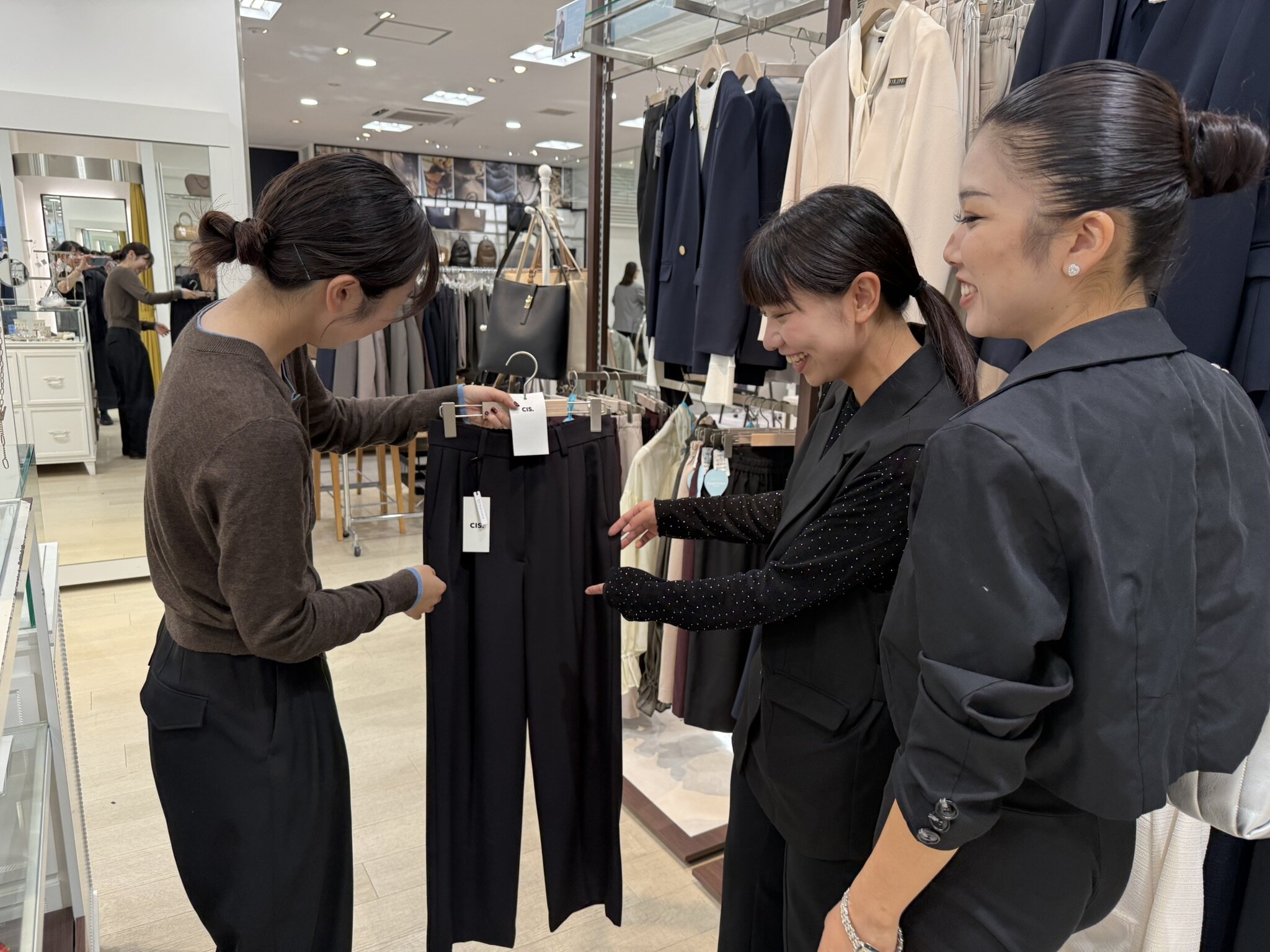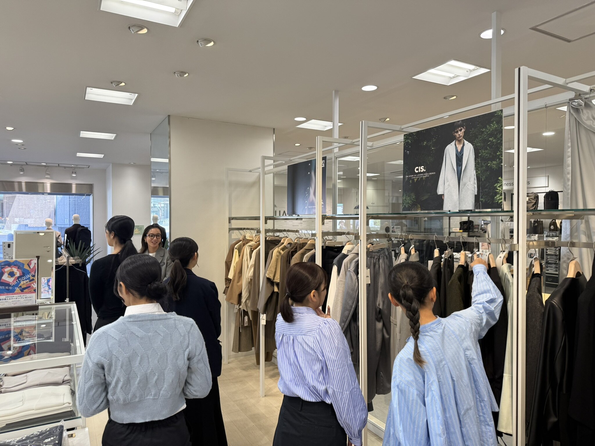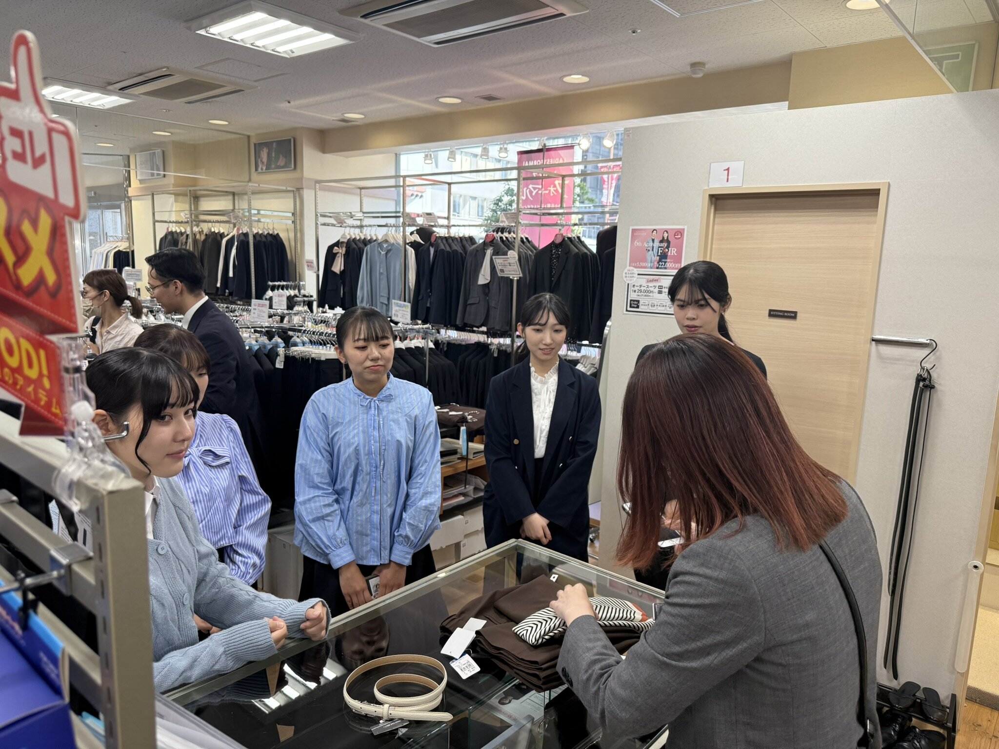10月17日には本学ファッション・ハウジングデザイン学科 西川良子准教授のゼミ生(3年生および4年生有志)が青山商事株式会社の店舗を見学しました。会場は「SUIT SQUARE」神戸三宮店および「洋服の青山」三宮店で、就職活動をテーマとした「コーディネート企画実習」を実施しました。実習ではまず同社担当者よりビジネスウェア業界や近年のリクルートスーツ事情について説明を受けた後、学生がチームごとに店舗を訪問。スタッフへのヒアリングを通して「第一印象をどう演出するか」「自分らしさをどう表現するか」といった視点からコーディネートを企画しました。実際に商品を手に取り、試着・撮影を行いながら、素材感や機能性、デザインの工夫などについて理解を深め、最後の発表では、学生が選定理由や着こなしのポイントを発表し、企業担当者から講評をいただきました。