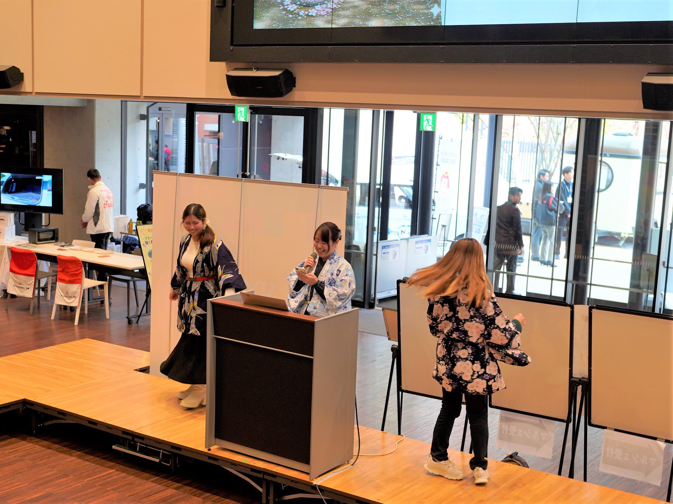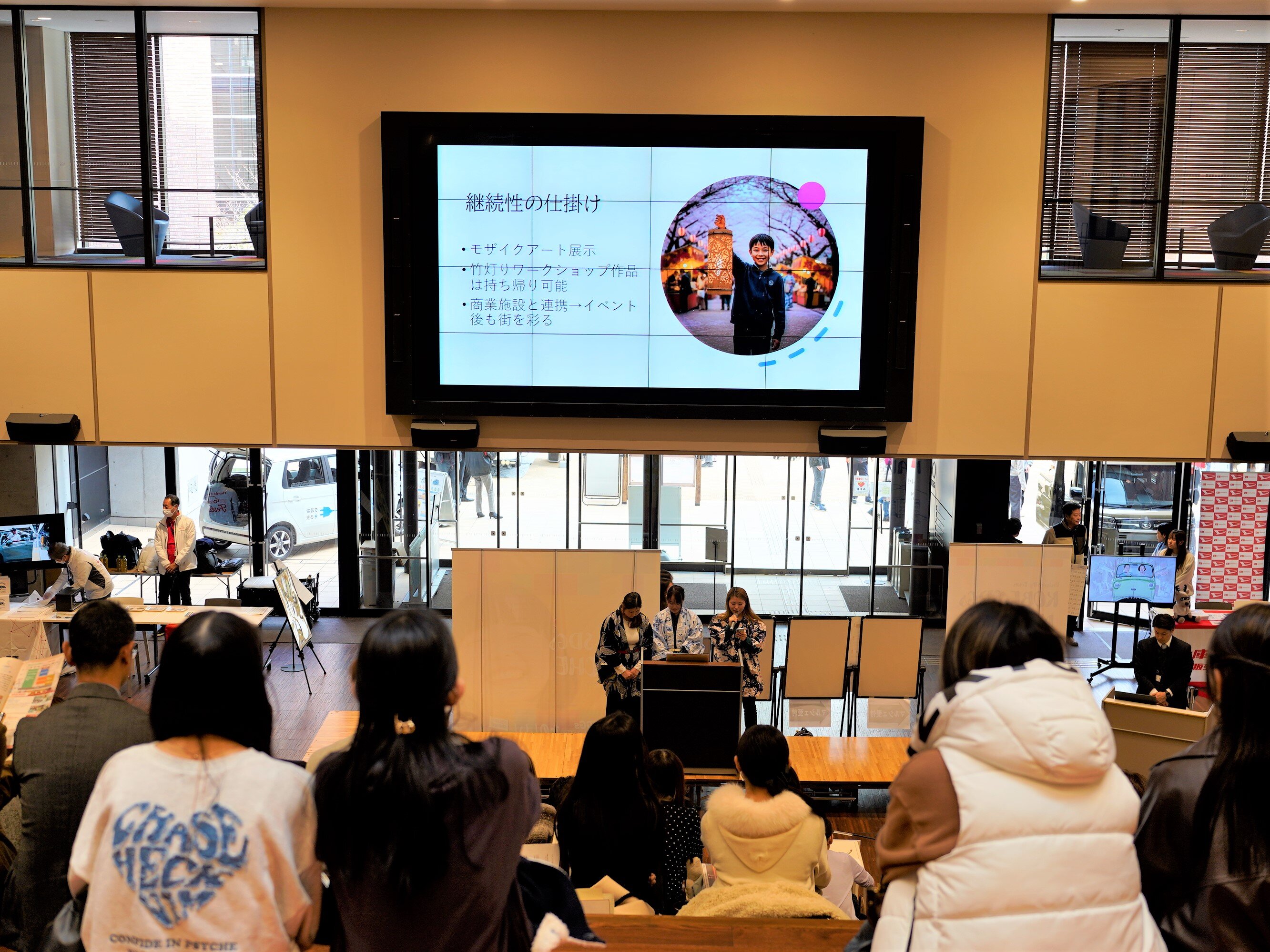 本学の地域連携スタッフ「Shoin Roots」のメンバーと、学生有志からなる彩宵祭(さいしょうさい)チーム は、「春の彩り×アート×街歩き」をテーマに、昼と夜で内容が変わる回遊型イベントを提案しました。中間発表で指摘のあったSDGsの視点を強化し、発表者自らひと手間加えた浴衣で登壇するなど、日本文化を体現した演出が参加者の注目を集めました。審査員からは海外観光客への魅力発信としても良いと評価をいただきました。