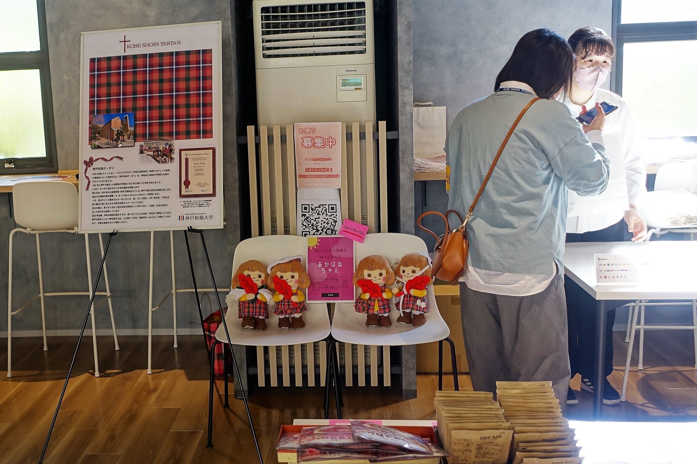 本学オリジナルの柄である「神戸松蔭タータン」の衣装(本学ファッション・ハウジングデザイン学科の学生制作)を着せた兵庫県共同募金会のマスコットキャラクター「あかはねちゃん」人形を、4号館1階学生ホールの「神戸松蔭タータングッズ」コーナーに展示しました。来場者からは「かわいい」「売って欲しい」などの声が相次ぎ、大変な注目を集めました。
