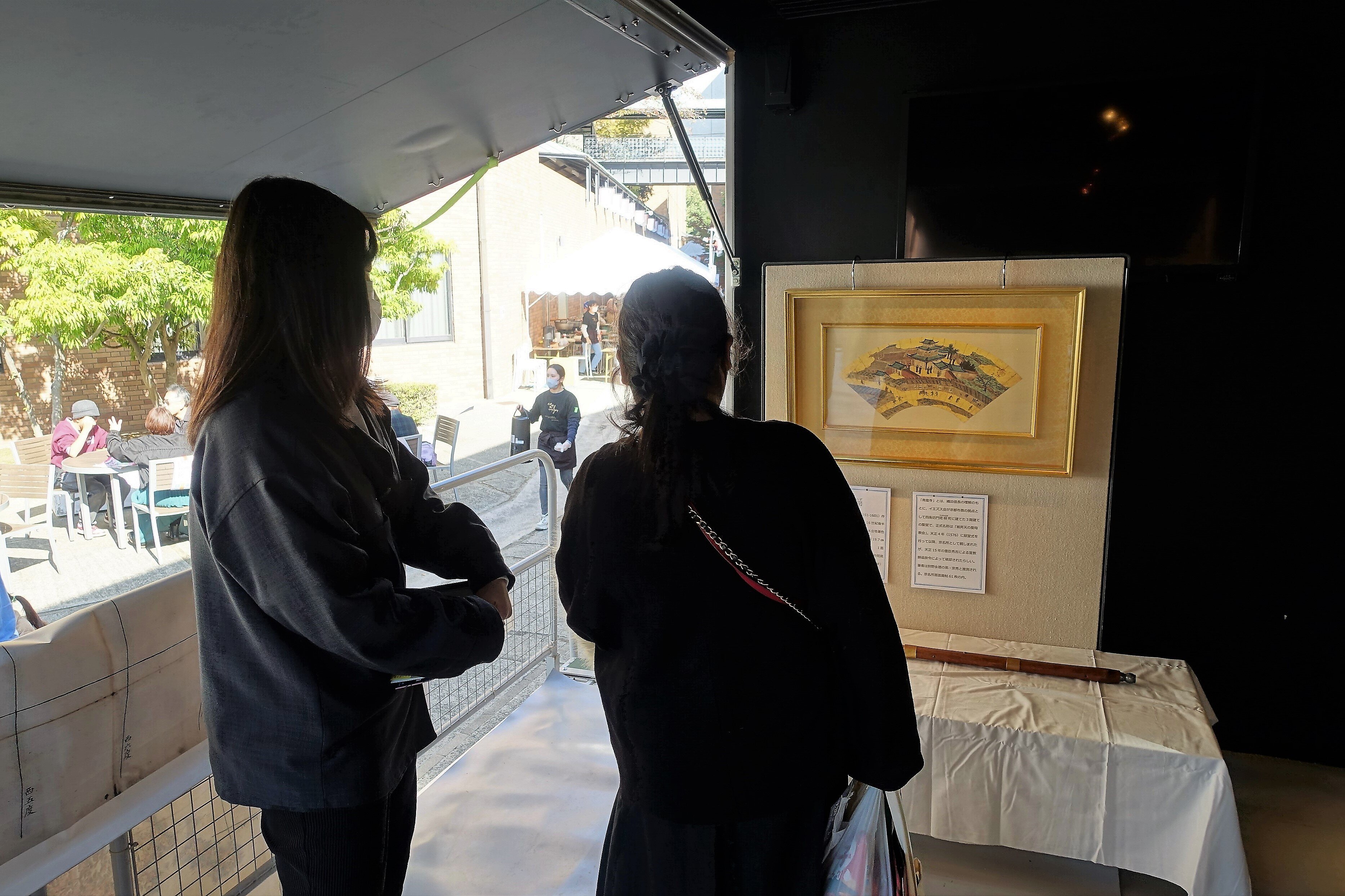 神戸市立博物館(神戸市中央区)が保有する移動博物館車「おきしお夢はこぶ号」による展示も8日に行われました。これは同博物館が所蔵する国宝・桜ヶ丘銅鐸や地図など名品の精巧なレプリカを搭載した移動展示車で、各地の学校や地域イベントに出向き、文化財や歴史の魅力を伝える取り組みです。今回の松蔭祭では、日本語日本文化学科の学芸員課程で学ぶ学生たちが今年8月に同館で下見し、選出した作品のレプリカ展示を実施。当日は来場者への説明も担当しました。