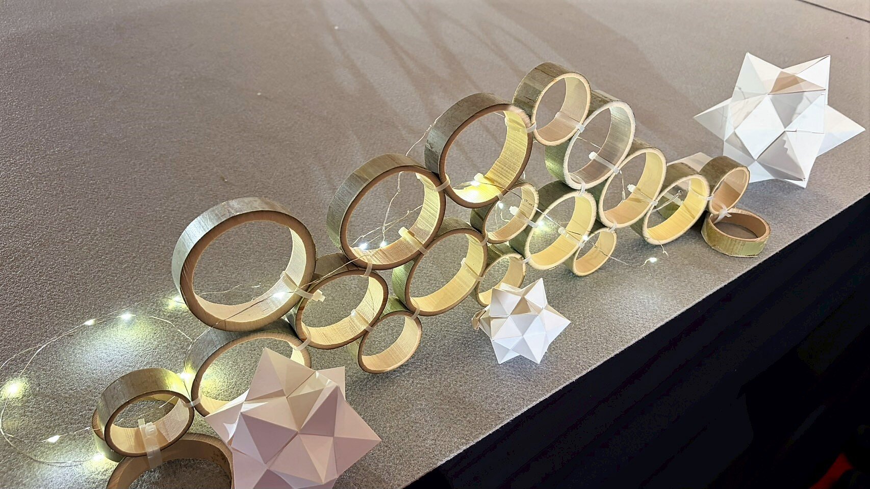11月8日に開催されたファッションショーのステージは「淡河(おうご)バンブープロジェクト」より提供いただいた竹素材を使って、ファッション・ハウジングデザイン学科生が演出しました。竹を輪切りに薄くスライスしたシンプルなパーツを組み合わせ、スタイリッシュなオブジェを構築することで、自然素材を生かしたモダンなステージが完成し、会場に新鮮な印象を与えました。