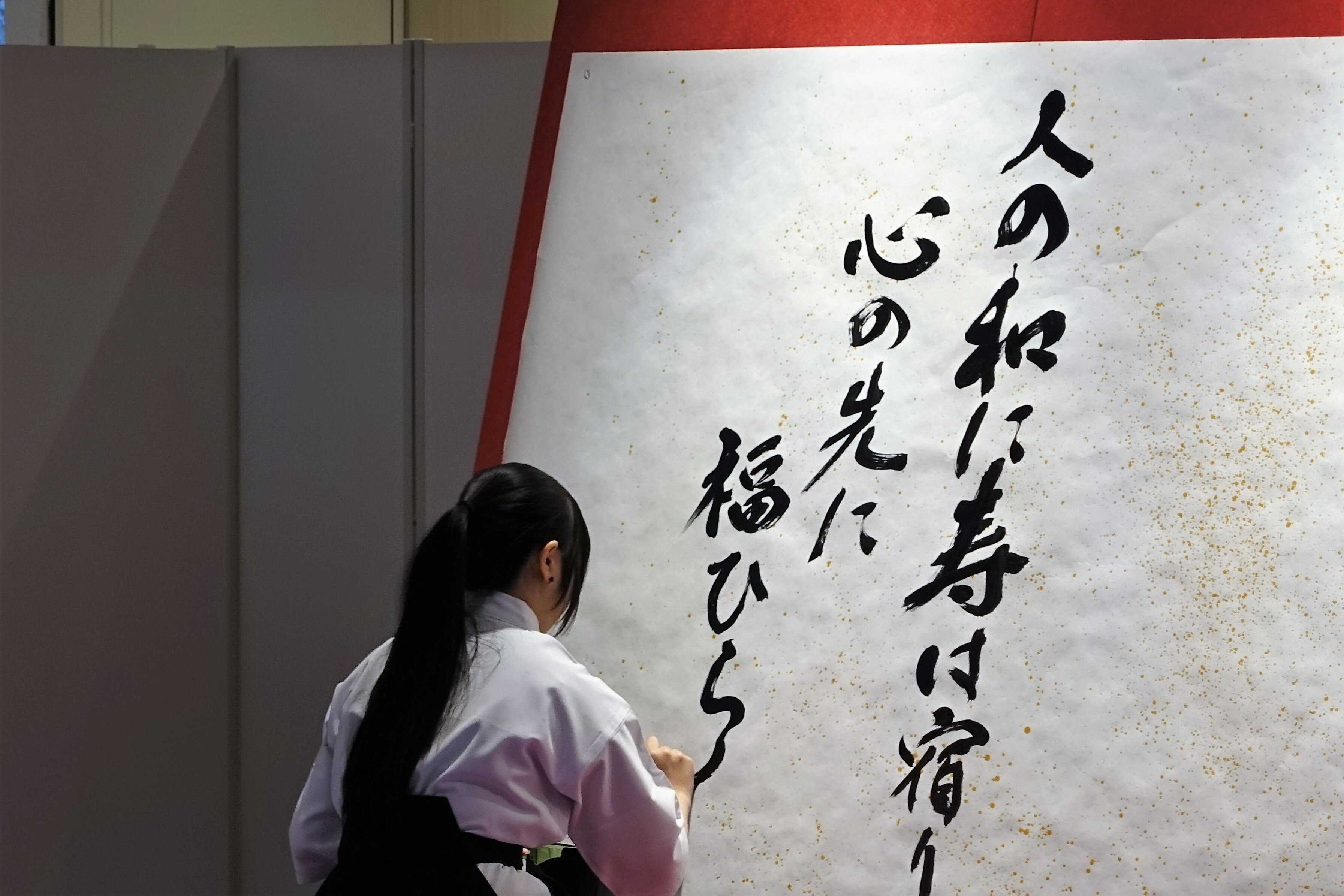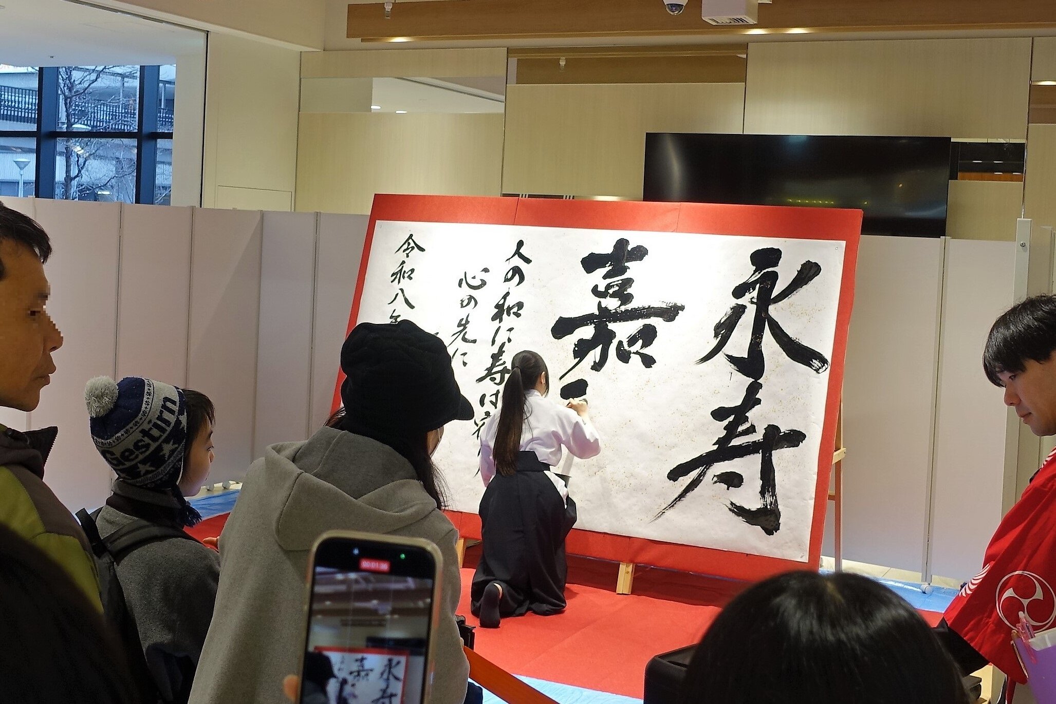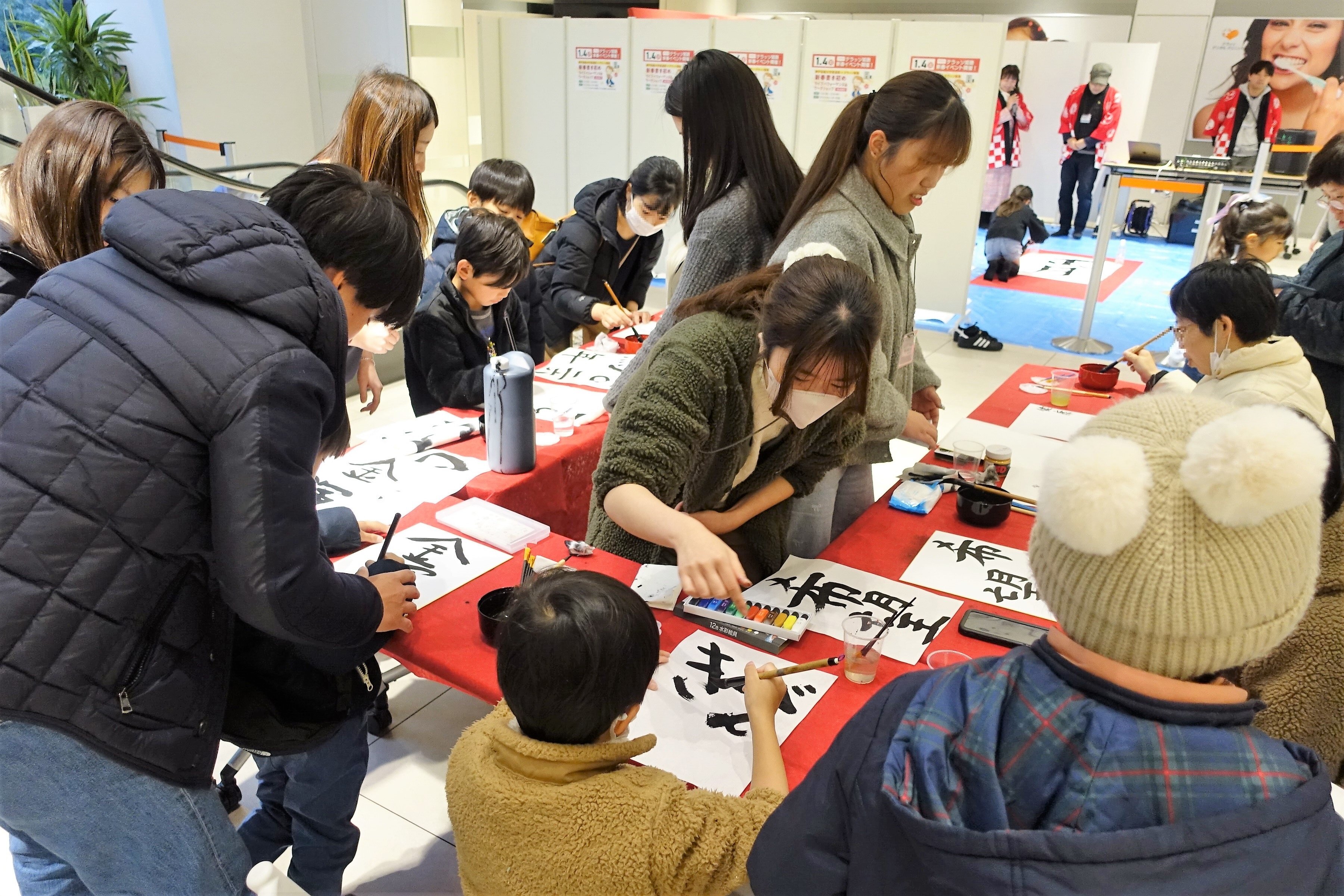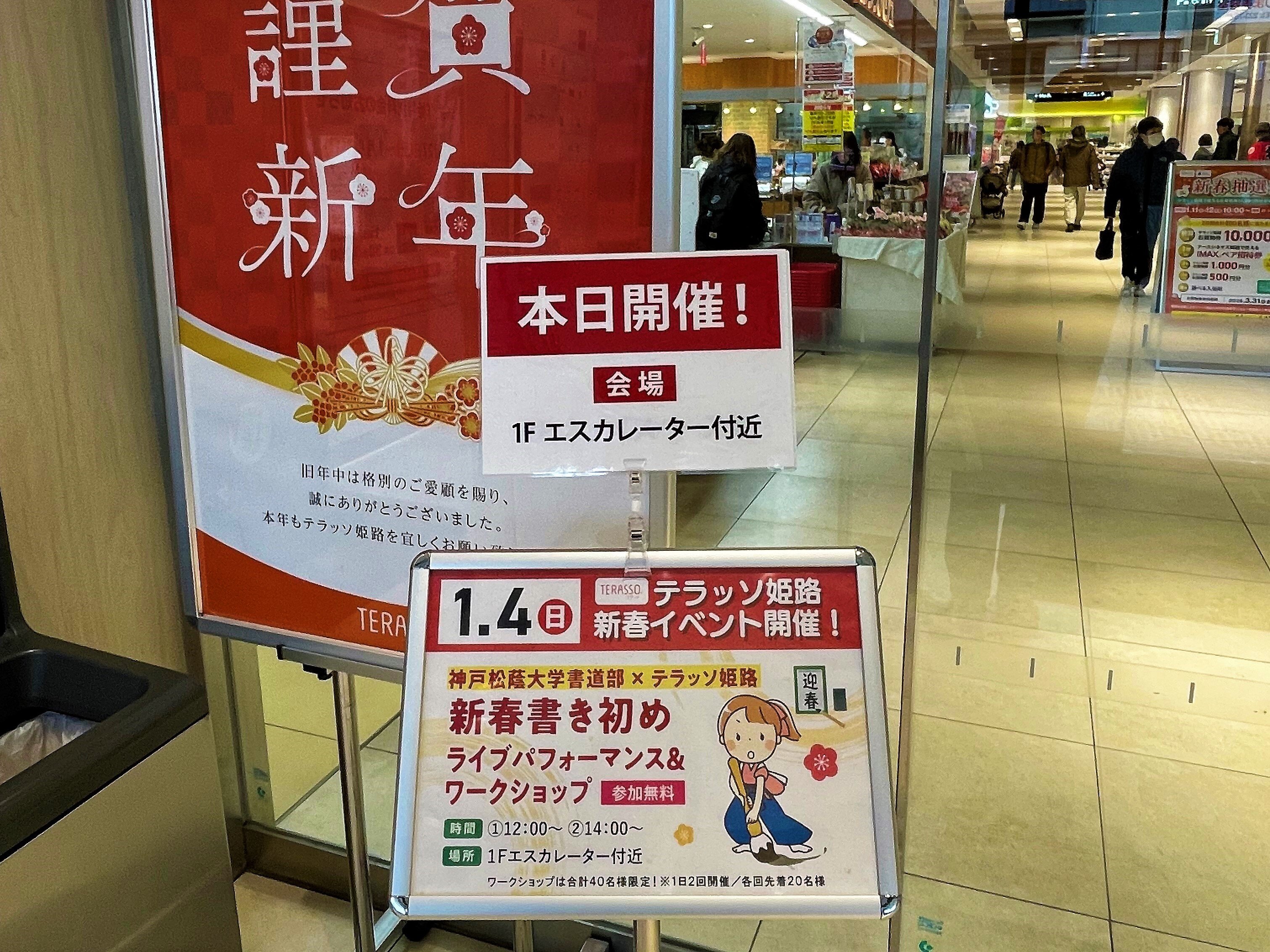 2026年1月4日、JR姫路駅東口すぐの商業施設「テラッソ姫路」において、本学書道部が「新春書き初めライブパフォーマンス&ワークショップ」を行いました。本イベントはテラッソ姫路の新春初売りフェア(1/2〜1/12)の特別企画として実施されたもので、初春の賑わいの中、多くの地域の方々にご参加いただきました。