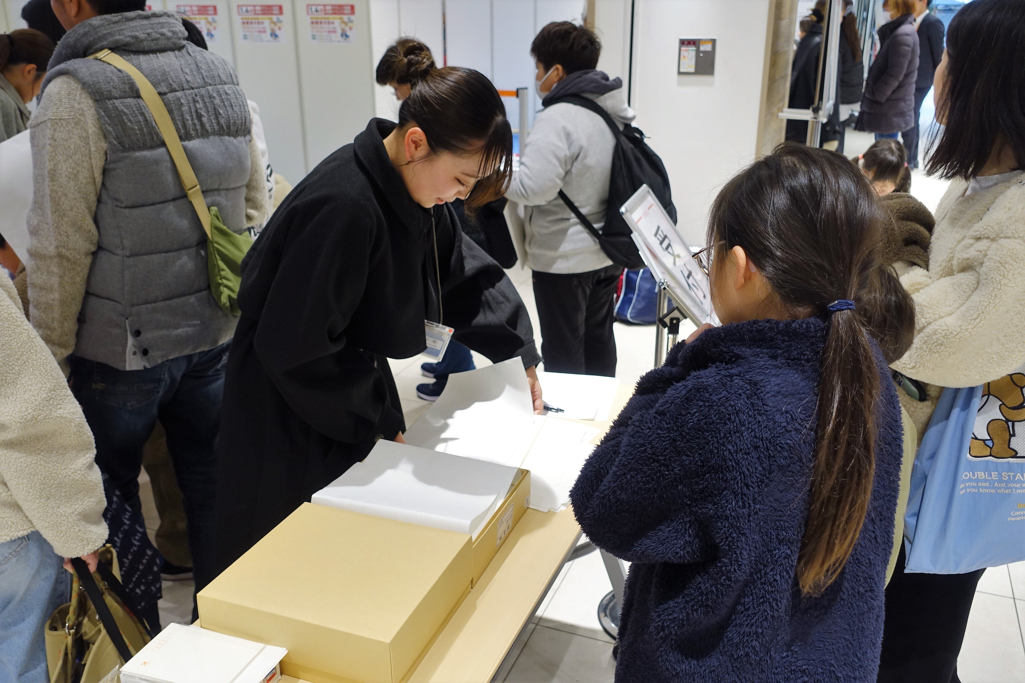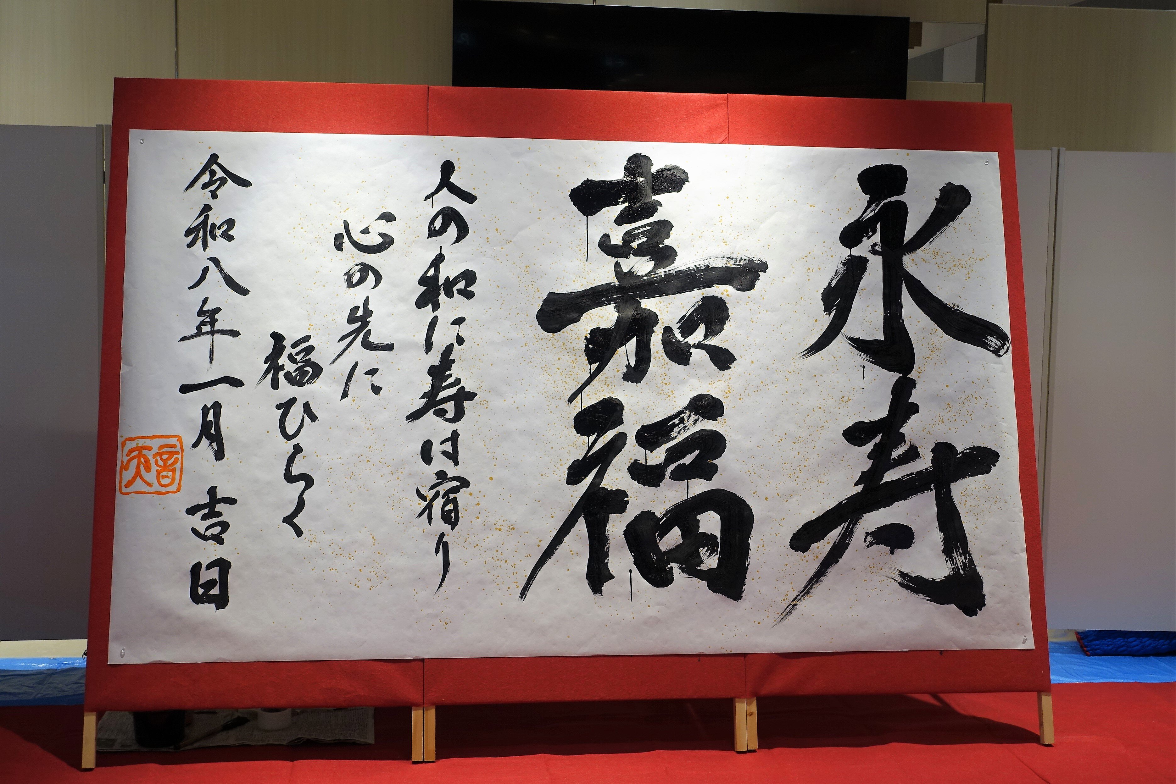 当日は12:00~と14:00~の2回に分けてパフォーマンスを実施。書道部員の東田天音さんが縦に張られた大きな紙に、新年にふさわしい流麗な文字を書き上げました。書の美しさと力強さが一体となったパフォーマンスは好評を博し、通行中の方も足を止めて鑑賞する光景が見られました。